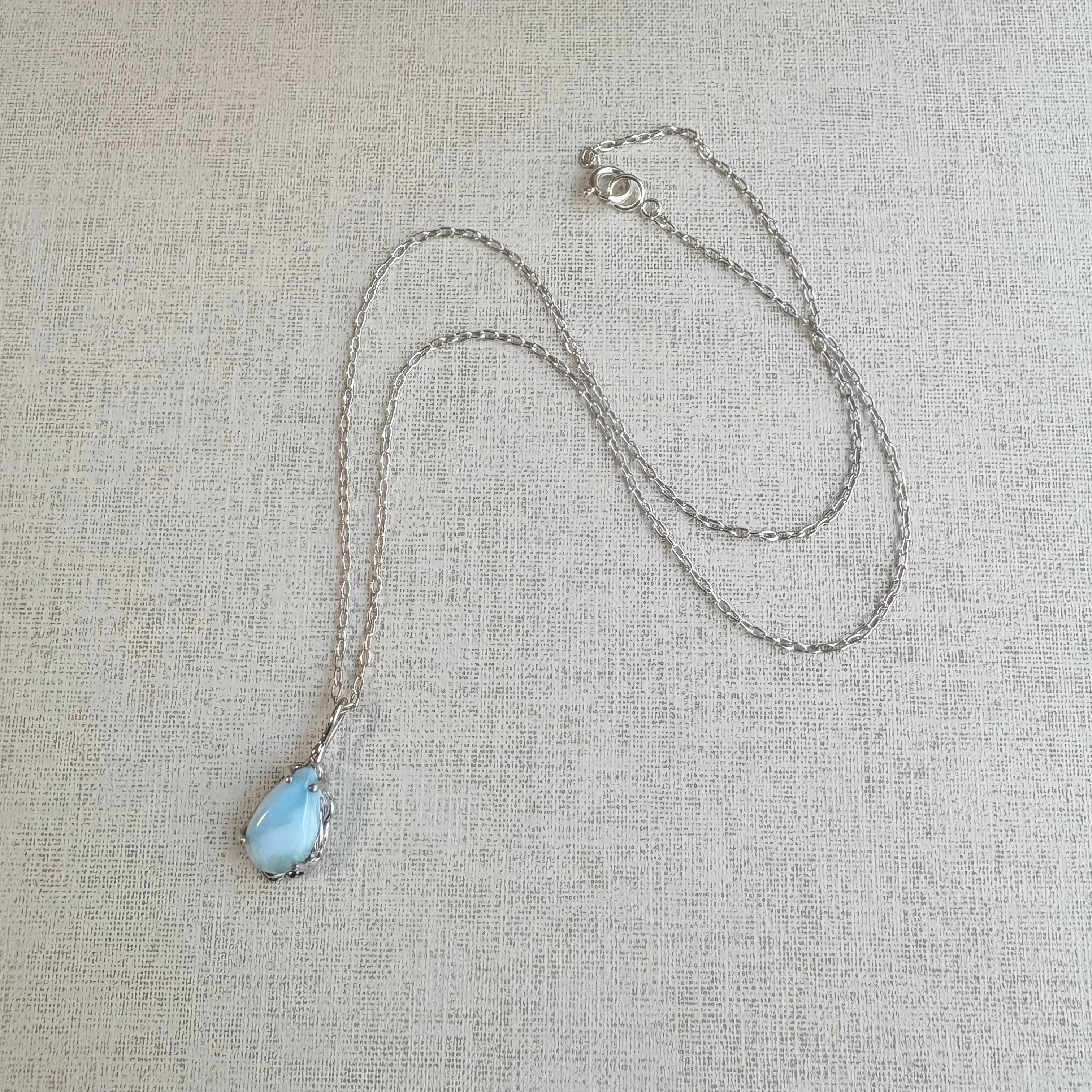 雫のかたちと明るく優しいブルーのラリマーが心地よさを感じるシルバーネックレス。